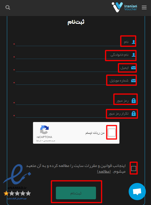 و سپس با کلیک در قسمت من ربات نیستم و پذیرش قوانین و مقررات سایت و در نهایت گزینه ثبت نام را بزنید
