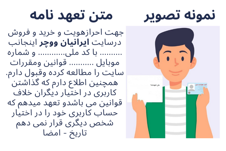 1- ارسال ویدیو سلفی با در دست داشتن کارت شناسایی و قرائت متن تعهد نامه به ایمیل ما به نشانی ([email protected]) و یا ارسال آن از طریق تلگرام با شماره ثبت شده ایشان به تلگرام ما به آدرس (https://t.me/iranian_voucher)